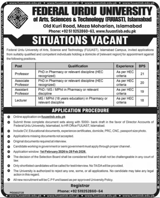 FUUAST Islamabad Jobs 2026 – Faculty Positions Announced at Federal Urdu University