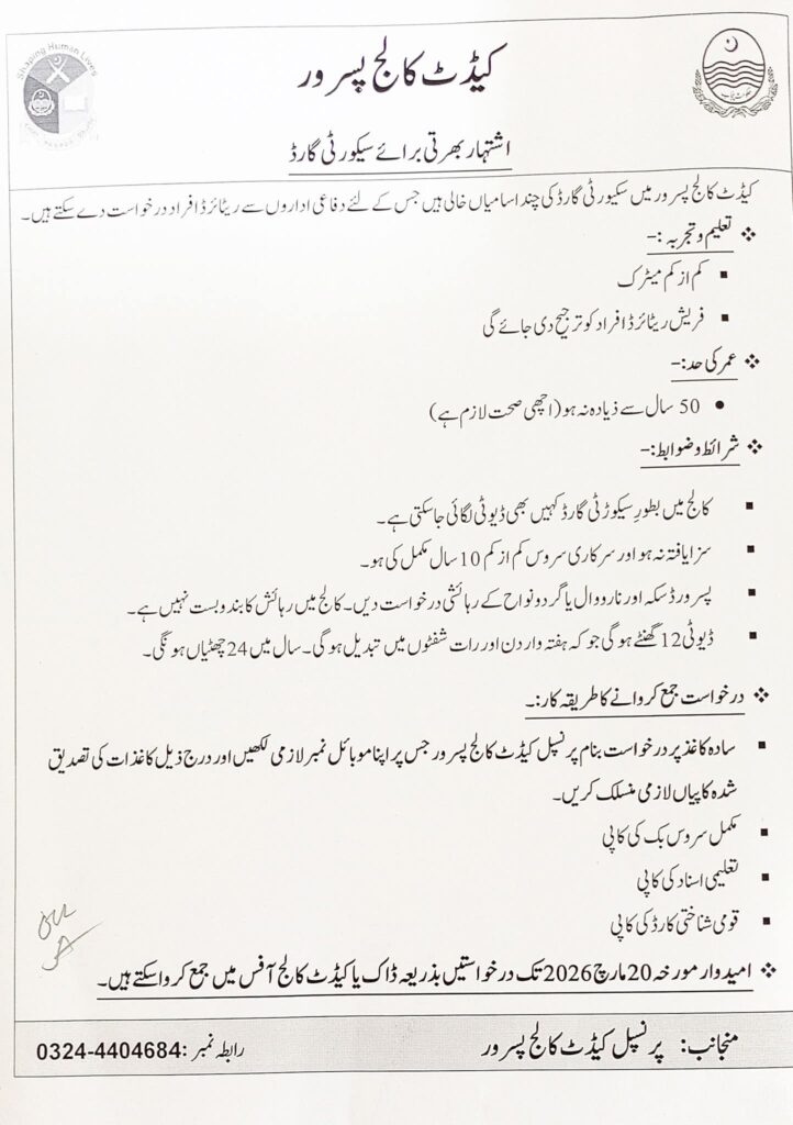 Latest Cadet College Pasrur Jobs 2026 announced new job opportunities for the position of Security Guard. Applications are invited from suitable candidates who meet the required qualifications and experience criteria. Preference will be given to candidates with security service experience, especially retired personnel from armed forces or security organizations.