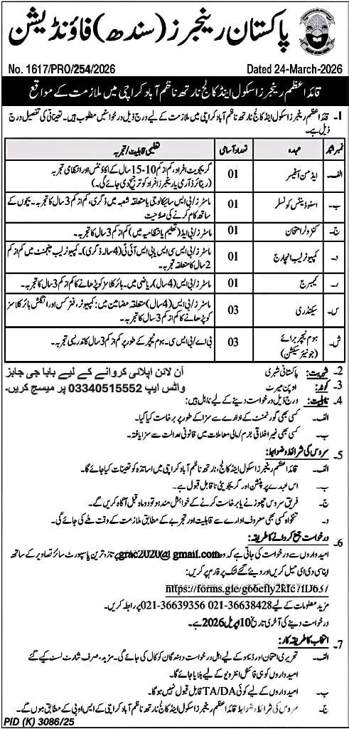 Pakistan Rangers Sindh Foundation Jobs 2026 in Karachi – Multiple Vacancies Announced