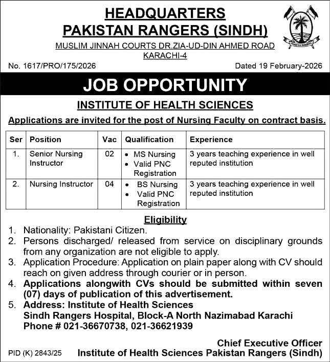 Headquarters Pakistan Rangers (Sindh) has announced new job opportunities at the Institute of Health Sciences on a contract basis. Applications are invited for Nursing Faculty positions from qualified and experienced candidates.