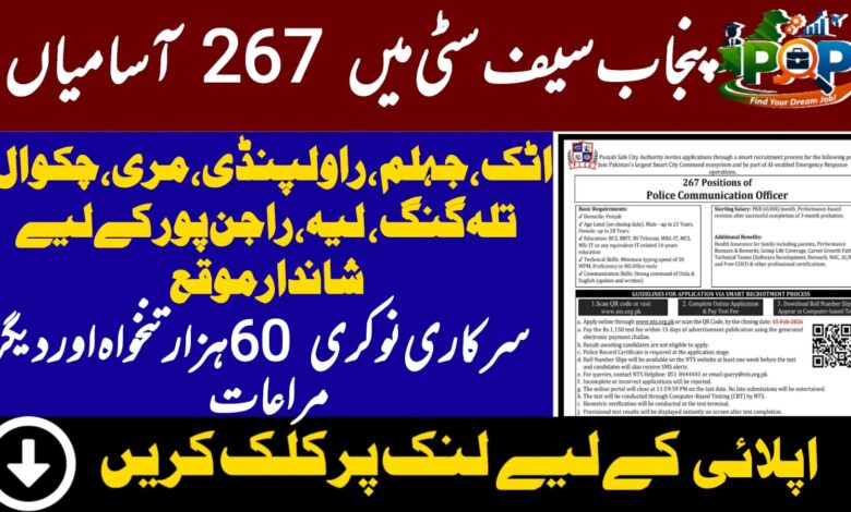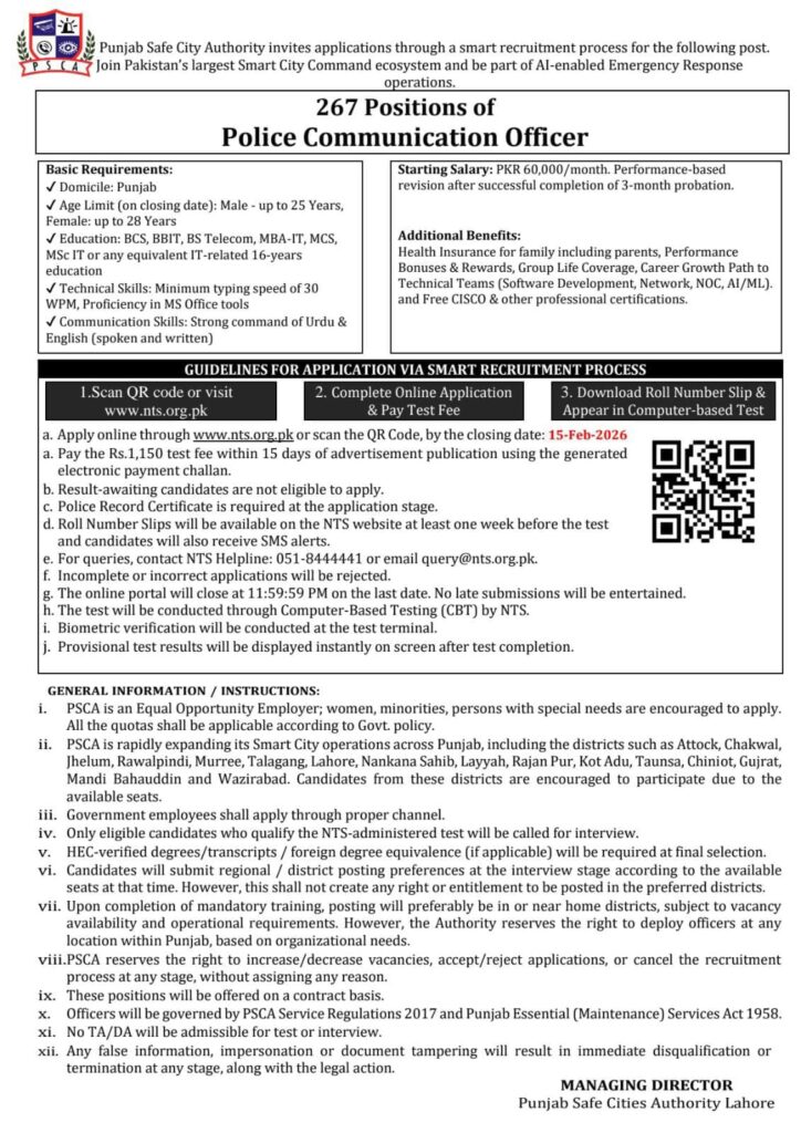 Punjab Safe City Authority PSCA has announced 267 positions for Police Communication Officer under its Smart City Command and AI-enabled Emergency Response operations. This is a major opportunity for candidates in Punjab looking for government IT and communication sector jobs. Recruitment will be conducted through National Testing Service NTS via computer-based testing.