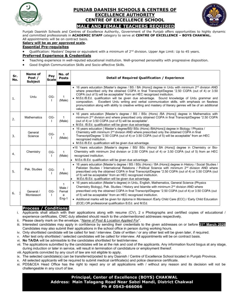 Punjab Daanish Schools jobs ,Government of Punjab, has announced new teaching vacancies for Centre of Excellence (Boys) Chakwal. Applications are invited from qualified and motivated candidates for academic staff positions. All appointments will be made on a contract basis according to the approved pay scale.